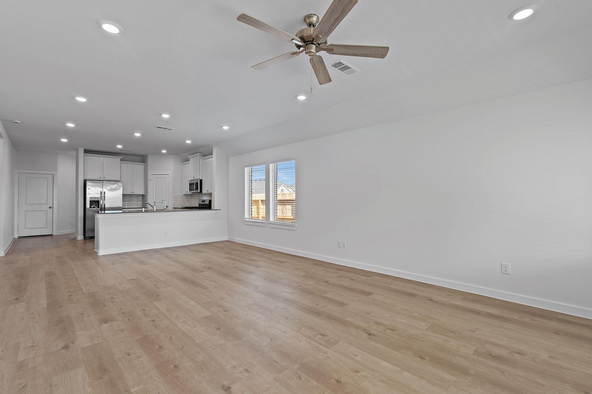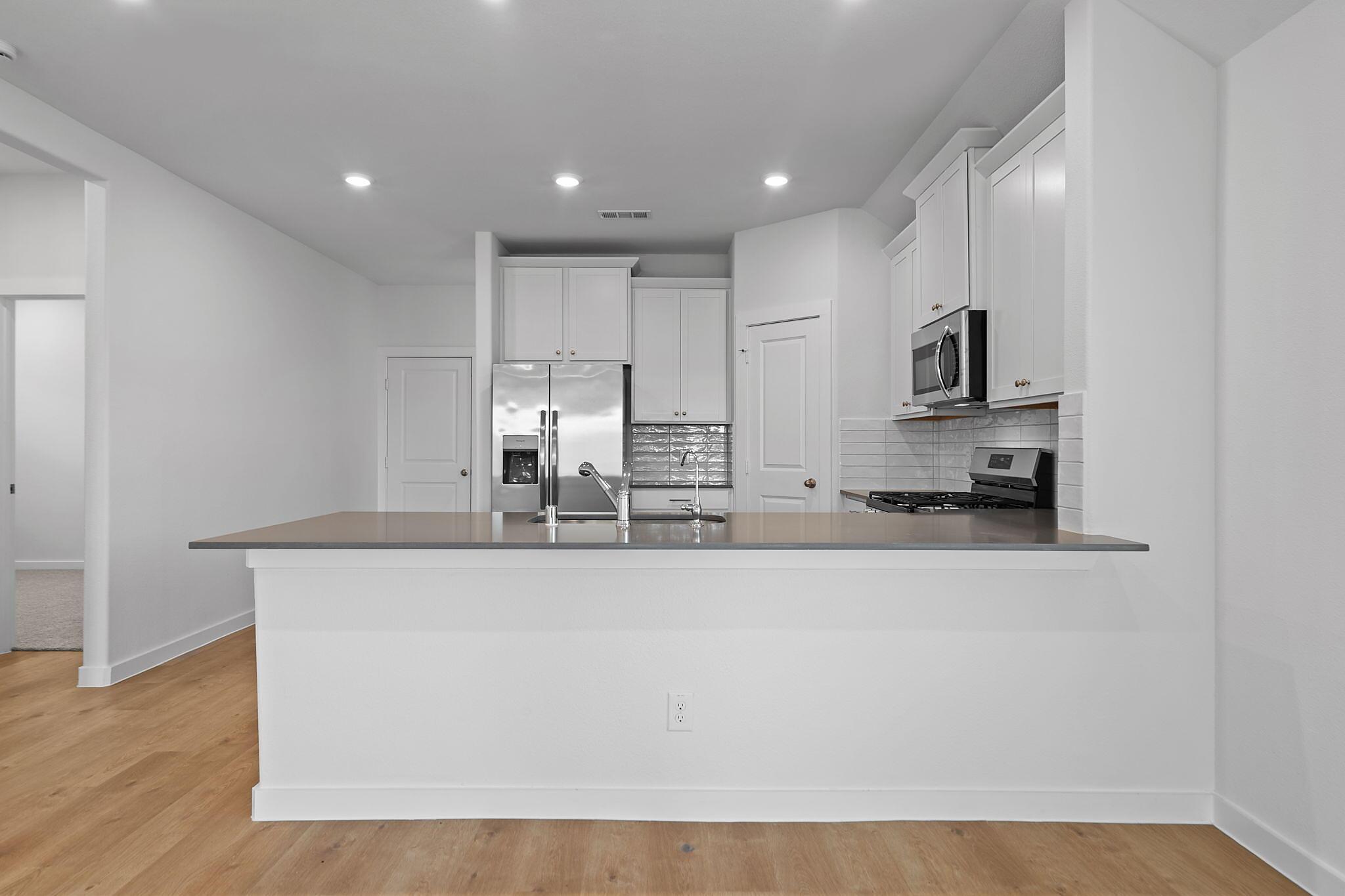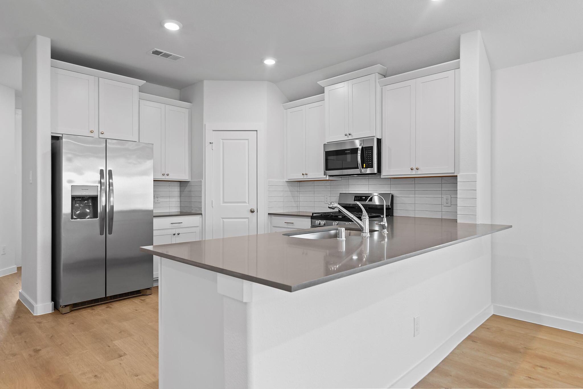The Kendall is a well-designed one-story home with 3 bedrooms, 2 full bathrooms, and 1,527 square feet of living space. The foyer leads to an open-concept kitchen, casual dining area, and living room, perfect for gatherings. A covered patio extends from the living room, offering an ideal spot for outdoor relaxation. The primary bedroom, located at the back of the home, features a walk-in closet and an en-suite bathroom with dual vanities. Two additional bedrooms are situated near the front, sharing a full bathroom.