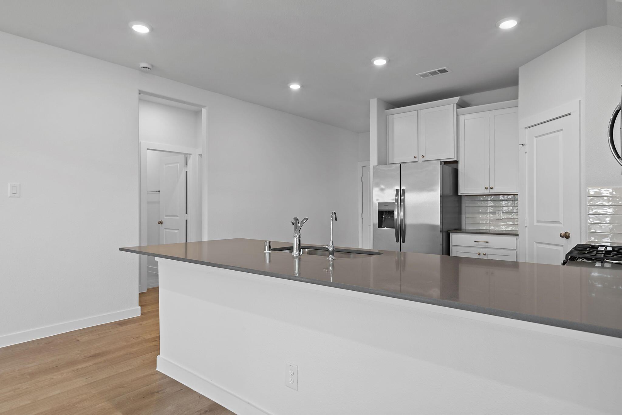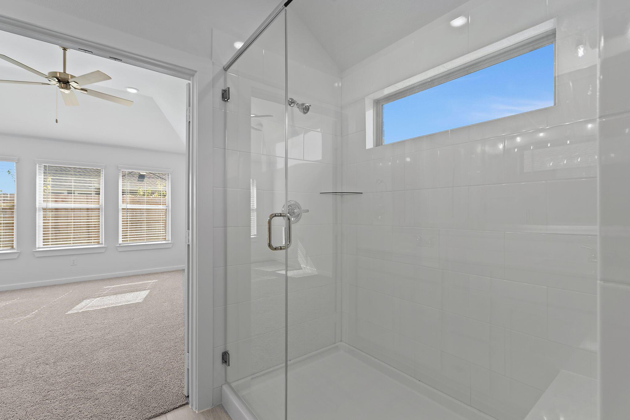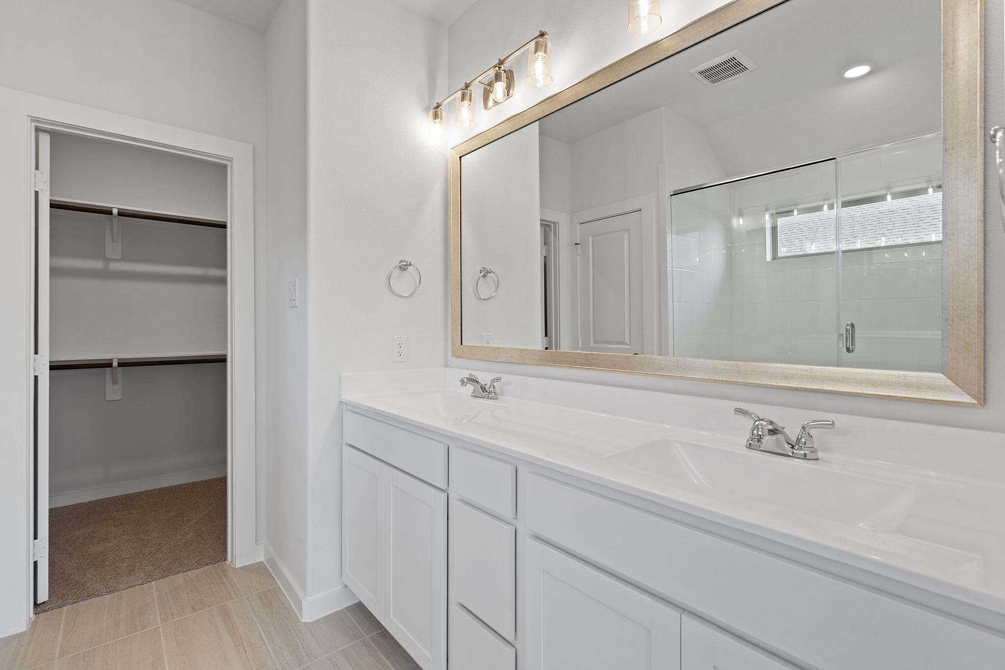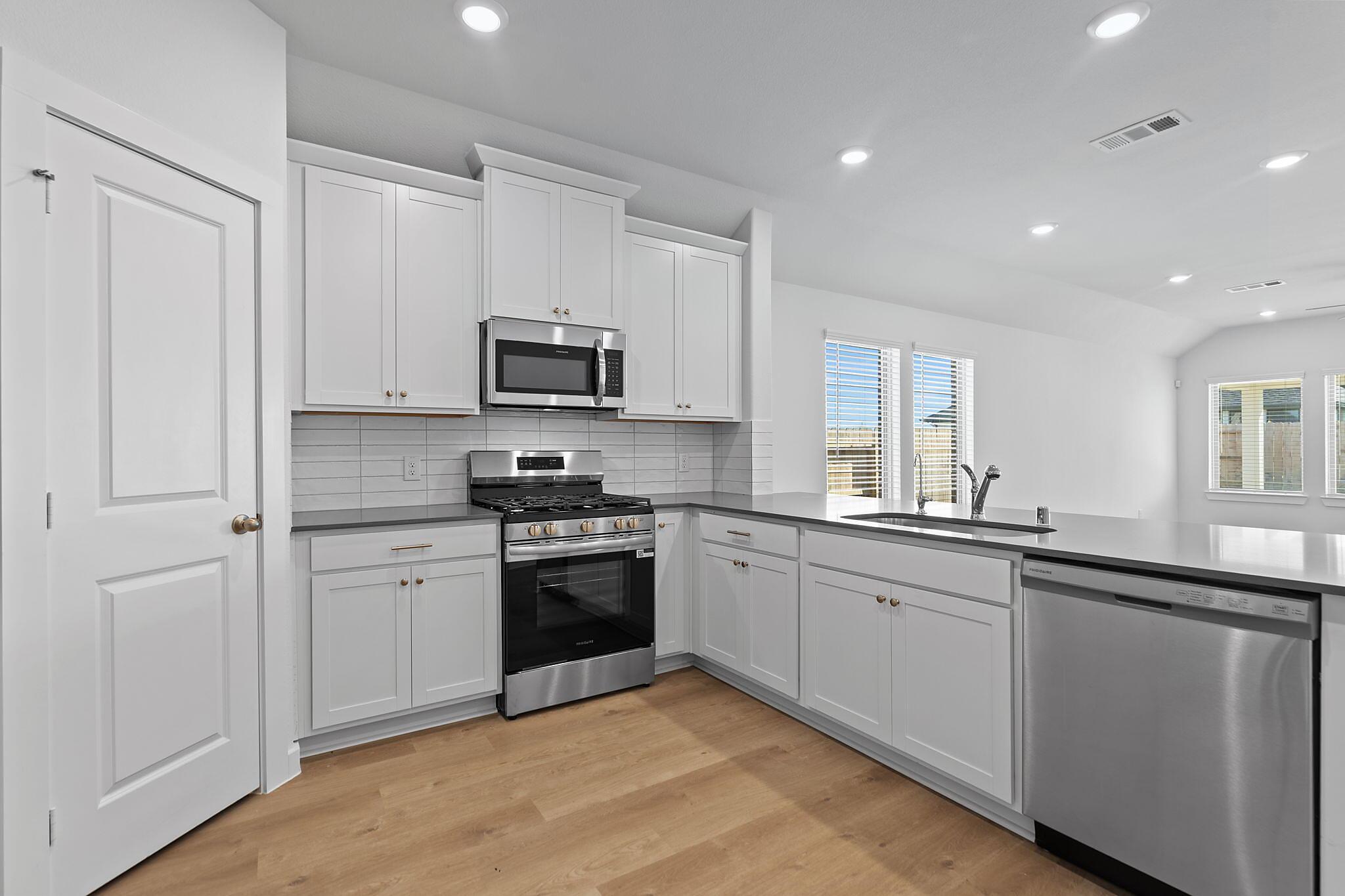 The Kendall is a well-designed one-story home with 3 bedrooms, 2 full bathrooms, and 1,527 square feet of living space. The foyer leads to an open-concept kitchen, casual dining area, and living room, perfect for gatherings. A covered patio extends from the living room, offering an ideal spot for outdoor relaxation. The primary bedroom, located at the back of the home, features a walk-in closet and an en-suite bathroom with dual vanities. Two additional bedrooms are situated near the front, sharing a full bathroom.